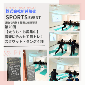 🍑 ヒップアップ&体力向上! 第20回運動習慣促進イベント開催! 2025年11月13日 お知らせブログ 昼休みに響く、心地よい(?)悲鳴! 今回は「太もも・お尻集中」がテーマ。音楽に合わせてスクワット&ランジを4種目、ガッツリ追い込みました! 終了後、「階段の上り下りで太ももがぶるぶるする人続出です…!」との嬉しい悲鳴が!😂 これぞ、効かせた証拠ですね✨ 継続は力なり!20回目のイベントも無事終了。業務の生産性向上にもつながる(と信じて)、今後も運動習慣をサポートしていきます!